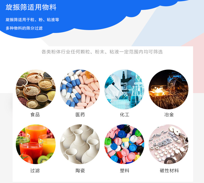 旋振篩適用于粒、粉、粘液等多種物料的篩分過濾。對(duì)于一些高精度、易團(tuán)聚的粉末物料則會(huì)出現(xiàn)粘網(wǎng)現(xiàn)象。