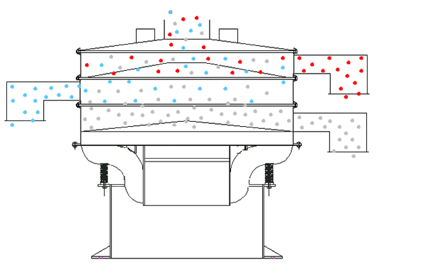 旋振篩是由直立式電機(jī)作激振源,電機(jī)上、下兩端安裝有偏心重錘,將電機(jī)的旋轉(zhuǎn)運(yùn)動(dòng)轉(zhuǎn)變?yōu)樗健⒋怪?、傾斜的三次元運(yùn)動(dòng),再把這個(gè)運(yùn)動(dòng)傳遞給篩面。調(diào)節(jié)上、下兩端的相位角,可以改變物料在篩面上的運(yùn)動(dòng)軌跡。