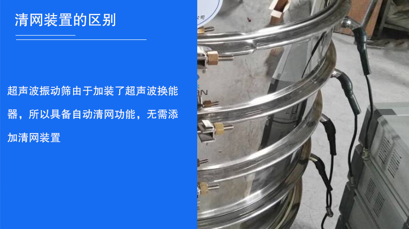 超聲波振動(dòng)篩由于加裝了超聲波換能器,所以具備自動(dòng)清網(wǎng)功能,無(wú)需添加清網(wǎng)裝置。