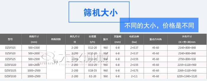 煙草直線振動篩的大小有多種(如:DZSF-515、DZSF-520、DZSF-1020、DZSF-1230、DZSF-1540等),不同的大小,價格是不同的,相關(guān)參數(shù)及配置也是不同的,所以價格具一定的差異。不同的篩機大小可以滿足從小到大的各種產(chǎn)量需求。煙草直線振動篩每小時產(chǎn)量可達200KG-10T。