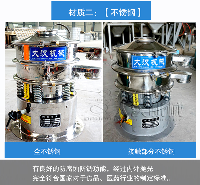 不銹鋼振動(dòng)篩的結(jié)構(gòu)主要是【1.全不銹鋼;2.不銹鋼+碳鋼(與物料接觸部分為不銹鋼)】接觸物料為不銹鋼材質(zhì)的振動(dòng)篩主要是物料對(duì)接觸的設(shè)備材質(zhì)有所要求,防止物料與碳鋼接觸對(duì)物料進(jìn)行污染;全不銹鋼振動(dòng)篩是主要針對(duì)食品、醫(yī)藥等行業(yè),其使用環(huán)境要求嚴(yán)格,容易對(duì)設(shè)備進(jìn)行清理。具有良好的防腐蝕防銹功能,經(jīng)過內(nèi)外拋光后的304不銹鋼表面光滑無毛刺現(xiàn)象,完全符合國(guó)家對(duì)于食品、醫(yī)藥行業(yè)的制定標(biāo)準(zhǔn)。