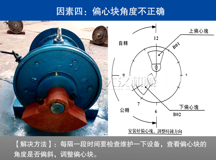 【解決方法】:每隔一段時(shí)間要檢查維護(hù)一下設(shè)備,查看偏心塊的角度是否偏斜,調(diào)整偏心塊。