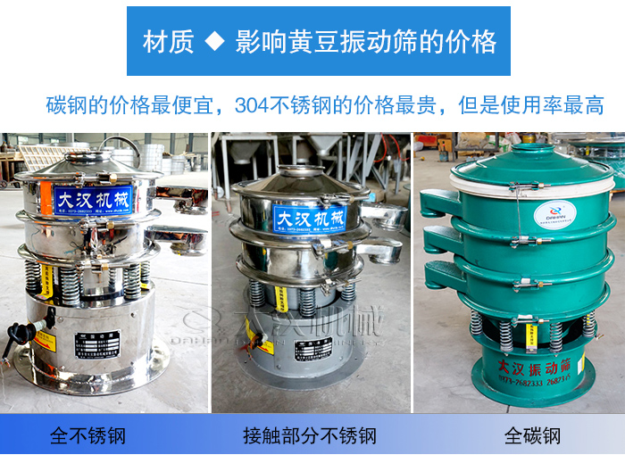 影響黃豆振動篩價格的因素有多種(如:材質(zhì)、型號、層數(shù)、設(shè)計、廠家等),那么今天就以材質(zhì)為例,為您說說黃豆振動篩的價格情況!