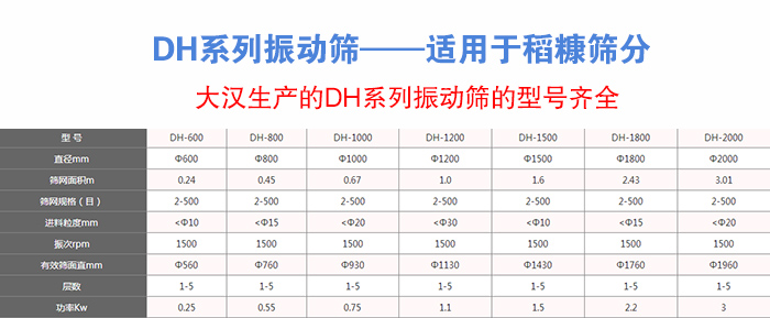 大漢生產(chǎn)的DH系列振動(dòng)篩的型號(hào)有(直徑單位:mm):DH-400、DH-600、DH-800、DH-1000、DH-1200、DH-1500、DH-1800、DH-2000等八種標(biāo)準(zhǔn)型號(hào)。不同型號(hào)的DH系列振動(dòng)篩滿足不同稻糠的篩分產(chǎn)量,下面小編就根據(jù)用戶常使用的兩款稻糠來為您做個(gè)簡單的介紹: