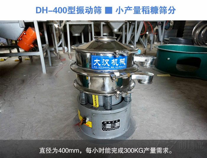 DH-400型振動(dòng)篩:篩機(jī)直徑400mm,篩分直徑350mm,可安裝篩網(wǎng):1-5層,轉(zhuǎn)速1440r/min,功率為0.18kw,每小時(shí)處理量為100kg-300kg。