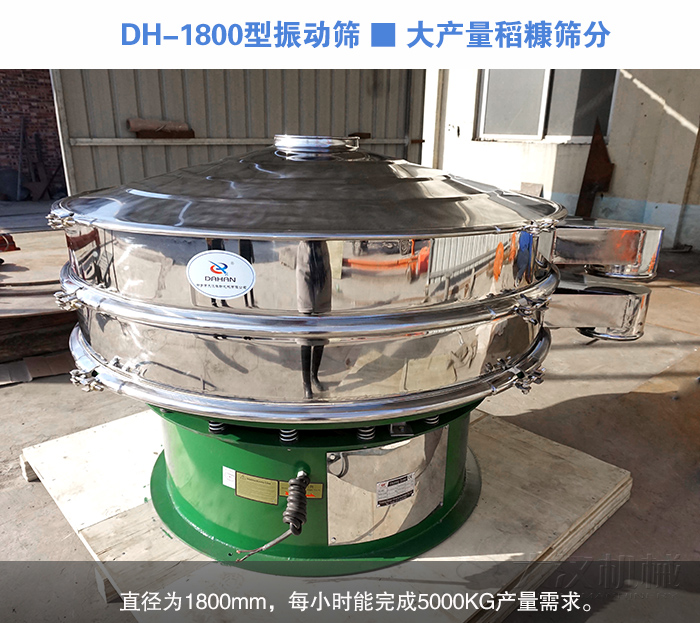 DH-1800型振動(dòng)篩:篩機(jī)直徑1800mm,篩分直徑1720mm,可安裝篩網(wǎng):1-5層,轉(zhuǎn)速1440r/min,功率為2.2kw,每小時(shí)處理量可達(dá)到3000kg-5000kg。