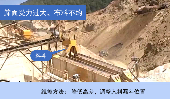 漏斗和圓振篩入料端距離太高,礦石從漏斗進入圓振篩時,對入料處沖擊力過大,導致入料處大梁斷裂、箱體開裂等問題;礦石進入圓振篩入料端后,分布不均勻,礦石總是往一側(cè)跑,只有一半的篩網(wǎng)起到篩分作用,導致一邊積礦嚴重,篩分效率低。