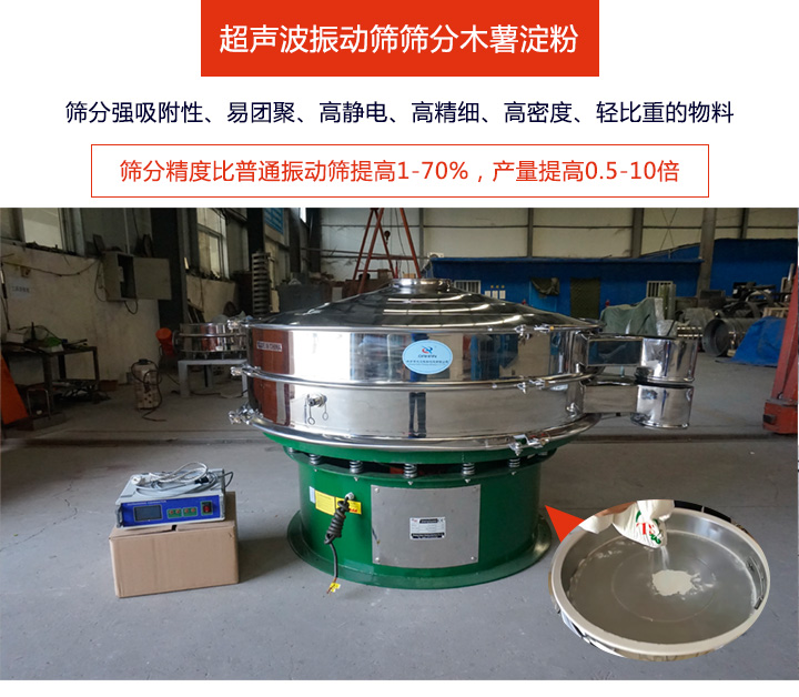 超聲波振動篩相當(dāng)于升級版的旋振篩,因加入超聲波篩分系統(tǒng),它可以解決精細(xì)粉末因強(qiáng)吸附性、易團(tuán)聚、高靜電、高精細(xì)、高密度、輕比重等篩分問題,尤其適合木薯淀粉的篩分。超聲波振動篩篩分效率高、不堵網(wǎng),篩分精度比普通振動篩可提高1-70%,產(chǎn)量可提高0.5-10倍,可單層使用,也可多層使用。