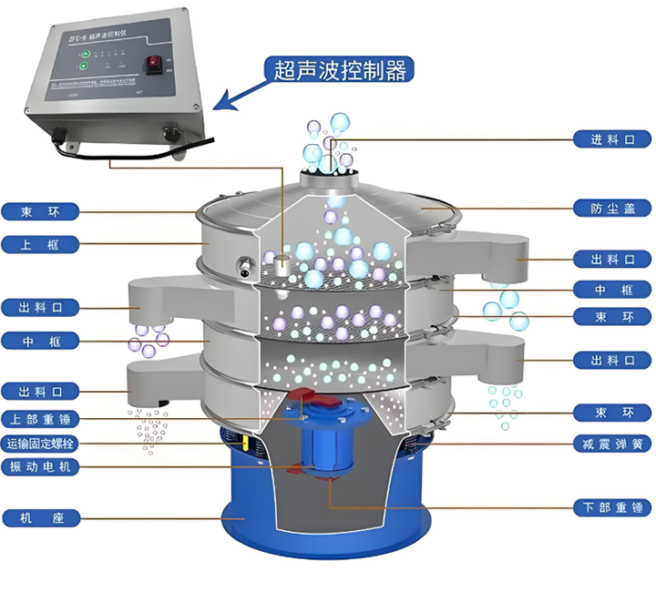 超聲波振動(dòng)篩廠家生產(chǎn)的通用結(jié)構(gòu)是振動(dòng)源、篩箱、篩網(wǎng)、超聲波系統(tǒng)及減震裝置等。振動(dòng)源為物料輸送供能;篩箱是物料篩分核心空間,內(nèi)部裝有200目或500目等不同目數(shù)的篩網(wǎng),篩網(wǎng)通過專用張緊裝置固定以保穩(wěn)定;超聲波系統(tǒng)含超聲波發(fā)生器和換能器,換能器可破物料團(tuán)聚、防堵網(wǎng);減震裝置裝于設(shè)備底部,能吸收設(shè)備運(yùn)行振動(dòng),減少對(duì)地面及周邊設(shè)備影響,同時(shí)保障設(shè)備穩(wěn)定運(yùn)行。我廠的超聲波發(fā)生器分為內(nèi)置式和外置式,并且我廠的超聲波振動(dòng)篩有法蘭式,能夠使物料輸送無泄漏。