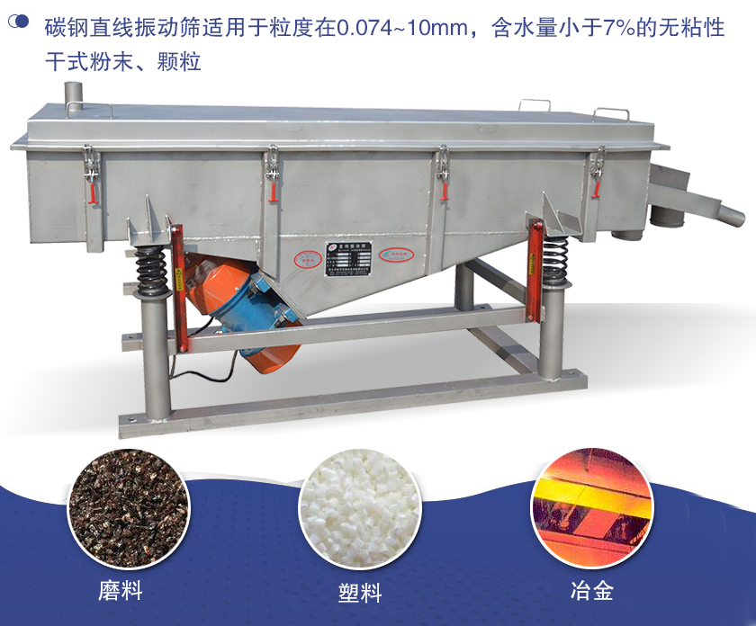 碳鋼直線振動篩適用于粒度在0.074~10mm,含水量小于7%的無粘性干式粉末、顆粒,主要用于磨料、化工、塑料、陶瓷、冶金、建材、糧食及化肥行業(yè)。